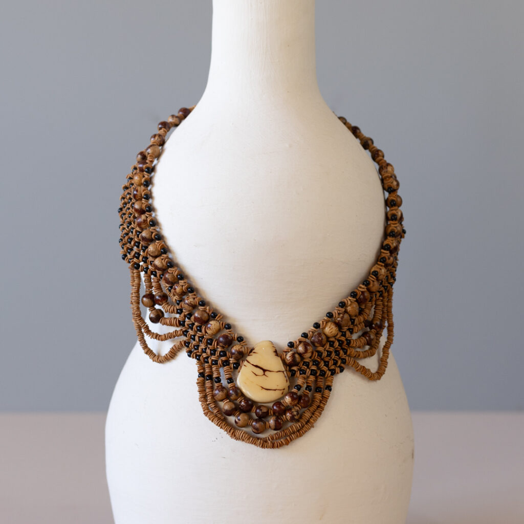 Colar biojoia feito artesanalmente com sementes de açaí e morototó tingidas e pingente de jarina (marfim vegetal). Possui fecho
