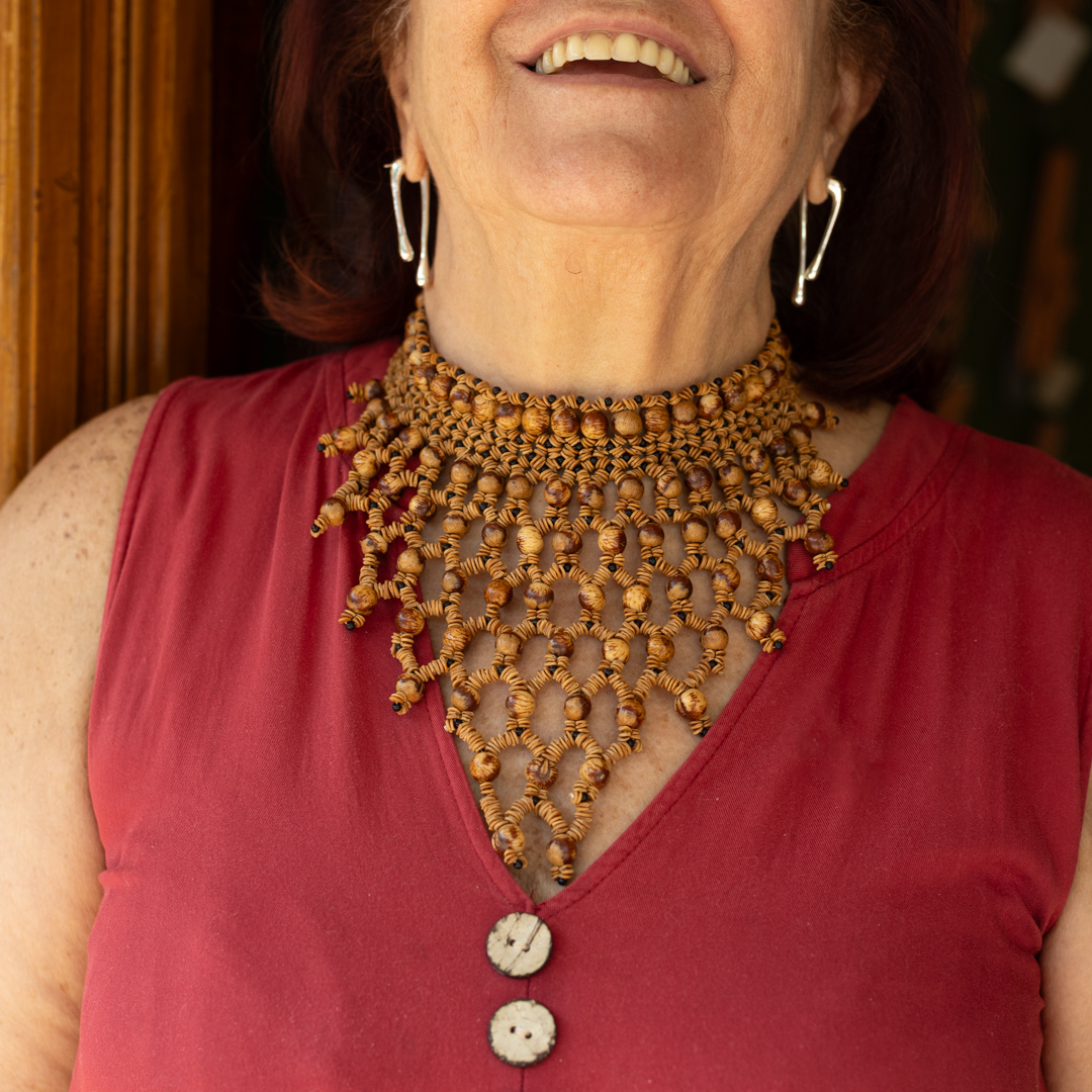 Colar biojoia feito artesanalmente com sementes de açaí e morototó tingidas. Possui fecho