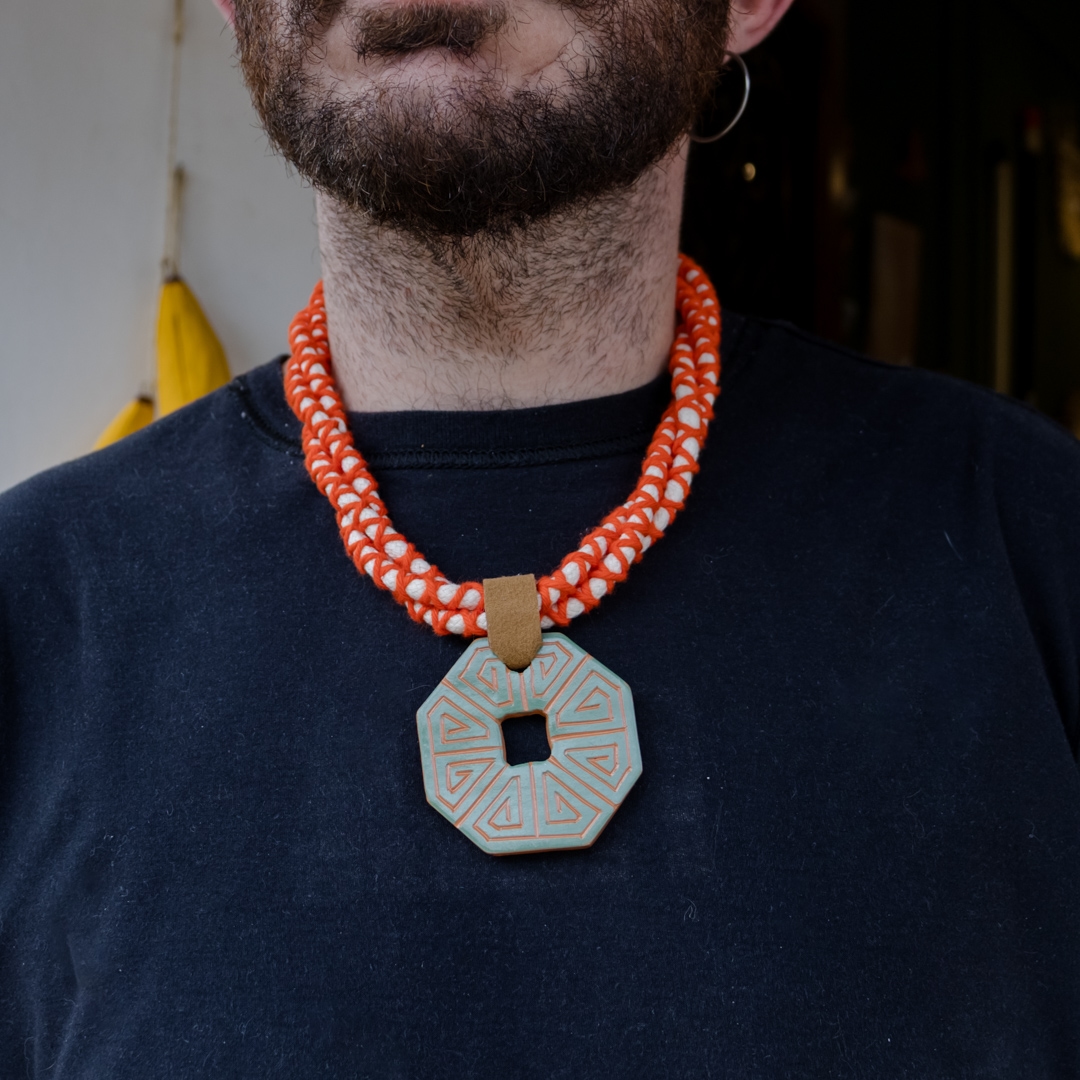Colar feito artesanalmente com fio de algodão trançado e pingente feito de cerâmica Marajoara. Possui fecho prateado