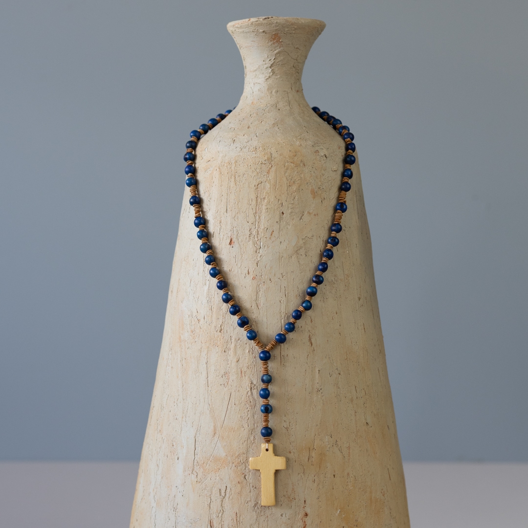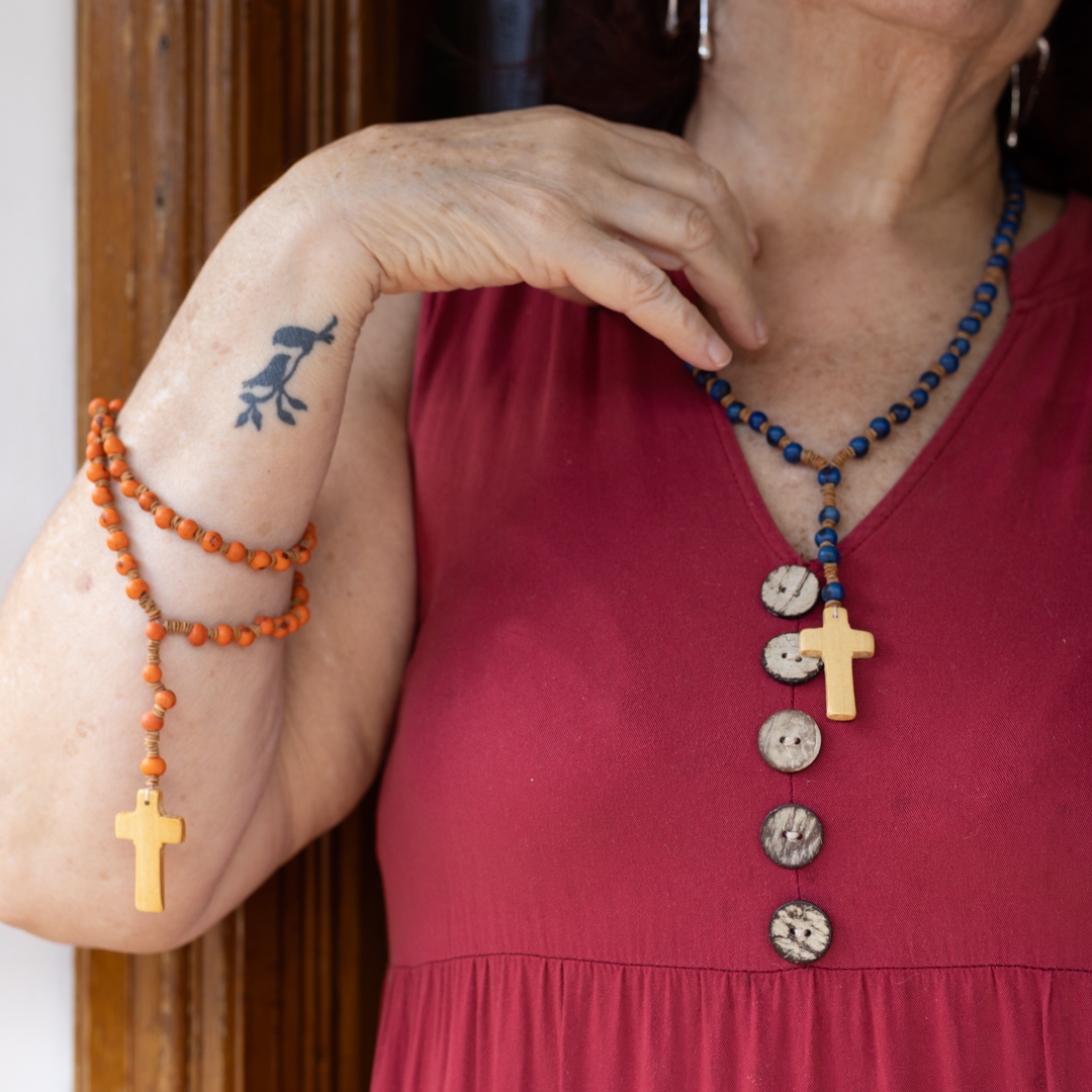 Terço biojoia feito artesanalmente com sementes de açaí e morototó tingidas e cruz de madeira