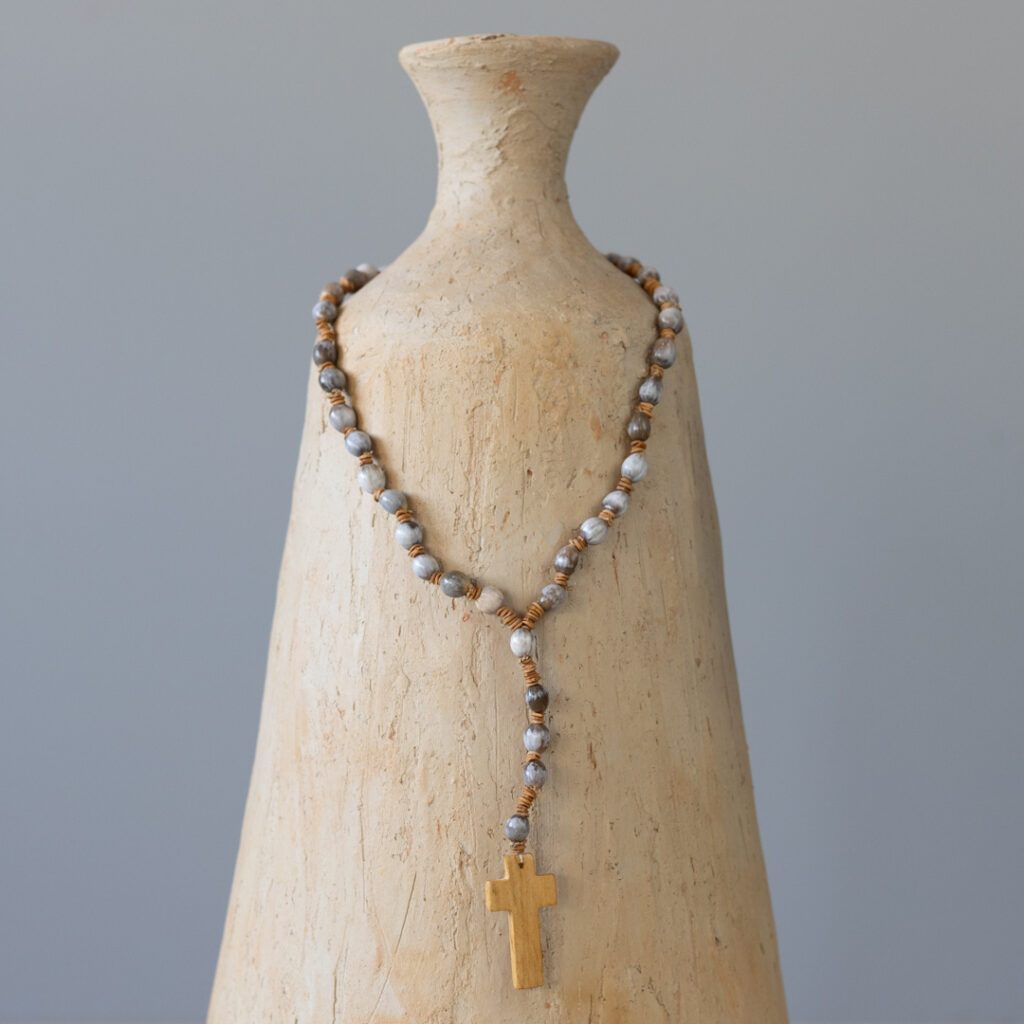 Terço biojoia feito artesanalmente com sementes de açaí e morototó tingidas e cruz de madeira