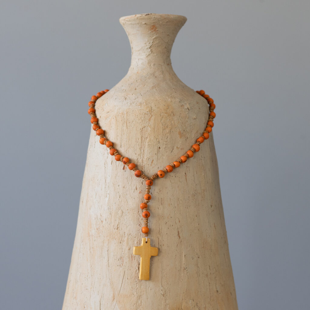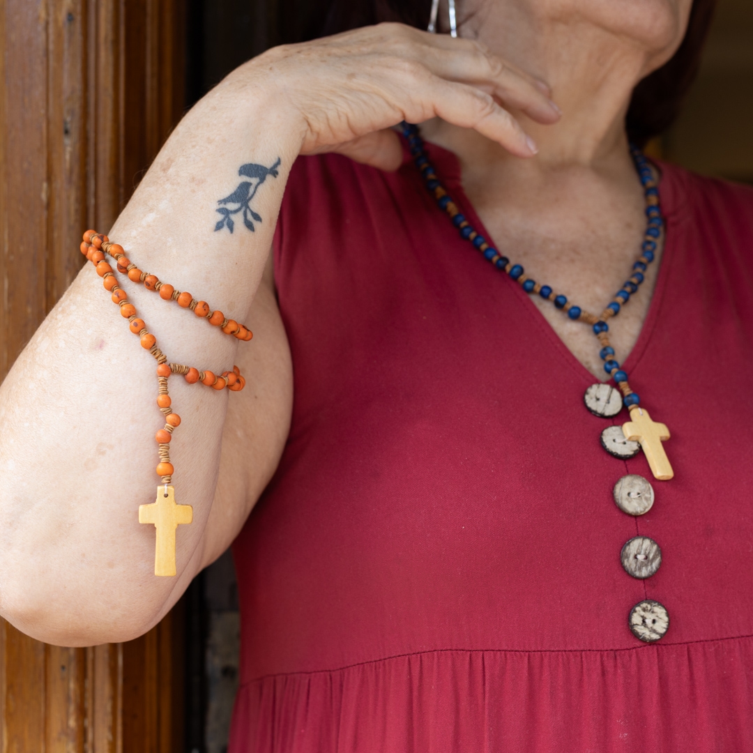 Terço biojoia feito artesanalmente com sementes de açaí e morototó tingidas e cruz de madeira