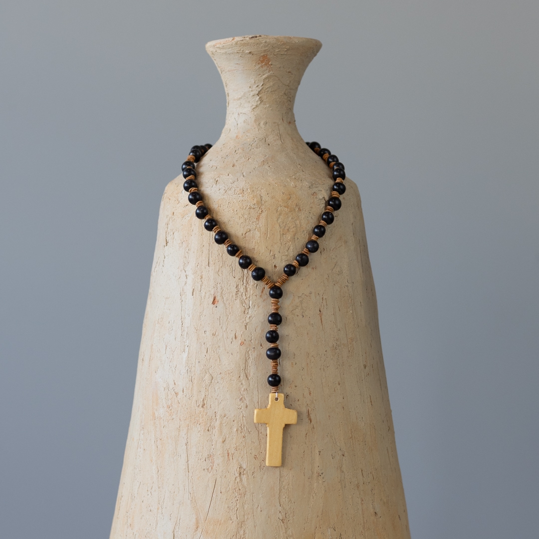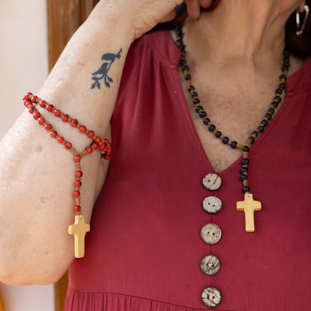 Terço biojoia feito artesanalmente com sementes de açaí e morototó tingidas e cruz de madeira
