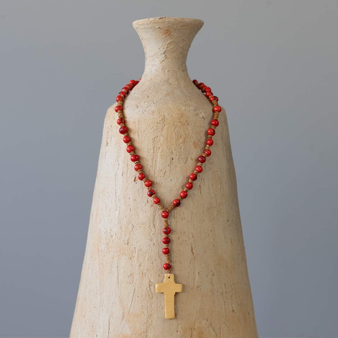 Terço biojoia feito artesanalmente com sementes de açaí e morototó tingidas e cruz de madeira