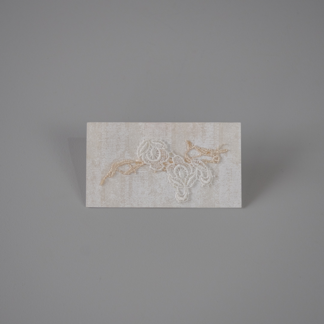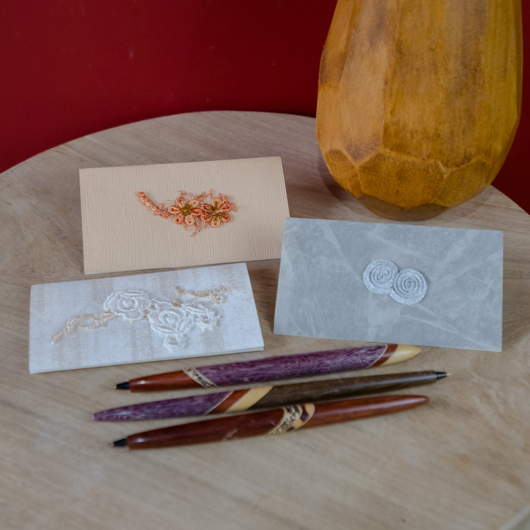 Cartão para presente feito a partir de papeis de alta qualidade, que seriam descartados do mostruário e foram reaproveitados pelas mulheres artesãs do grupo Maria Retalho